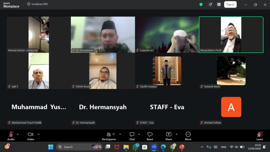 Jakarta – Dalam rangka meningkatkan pemahaman dan optimalisasi pelaksanaan Beban Kinerja Dosen (BKD), STAI Dirosat Islamiyah Al-Hikmah Jakarta menyelenggarakan kegiatan Sosialisasi Peta Jabatan Fungsional Dosen Tetap dan BKD pada hari Senin, 12 April 2026, pukul 10.00 WIB yang dilaksanakan secara daring melalui Zoom.